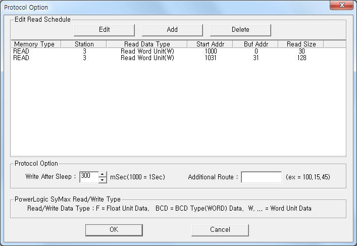 | <Figure 3> Example of Power Logic SY/MAX communication driver¡¯s read schedule Add/Edit dialog box |