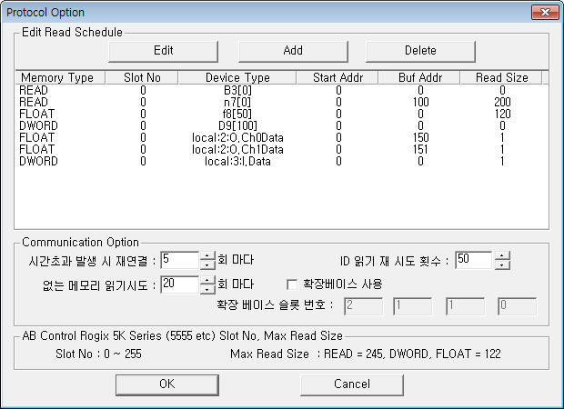 | <±×¸² 3> AB_LOGIX_5K Series Ethernet µå¶óÀ̹öÀÇ Åë½Å Àб⠼³Á¤ Ãß°¡/ÆíÁý ´ëÈ»óÀÚÀÇ ¿¹ |