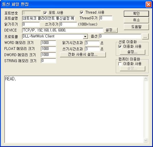 DEVICE ¼³Á¤ : Åë½ÅÆ÷Æ® ¼³Á¤ ½Ã DEVICE´Â TCP/IP, ¼¹ö1ÀÇ IP ¹øÁö, ¼ºñ½º Æ÷Æ® ( 6000 ~ 60003 ÁßÀÇ Çϳª ) ¼øÀ¸·Î ÀÔ·ÂÇÑ´Ù.
