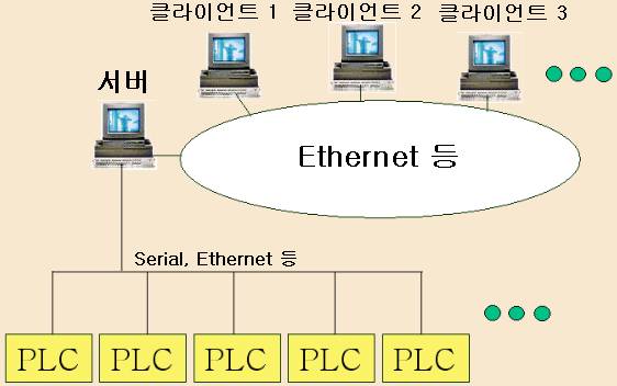 ´ÜÀÏ ¼¹ö/Ŭ¶óÀÌ¾ðÆ® ½Ã½ºÅÛÀº <±×¸² 1>ÀÇ ¿¹Ã³·³ ¼¹ö¿¡´Â PLC ( ¶Ç´Â ÄÜÆ®·Ñ·¯ ) µî°ú Á÷Á¢ Åë½ÅÇÏ¿© °¨½Ã/Á¦¾î ½Ã½ºÅÛÀ» ±¸¼ºÇÑ´Ù.