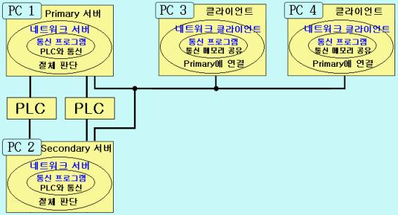 <±×¸² 1>ÀÇ ³×Æ®¿öÅ© ¼­¹ö/Ŭ¶óÀÌ¾ðÆ®´Â ´ÙÀ½°ú °°Àº ¹æ¹ýÀ¸·Î ¼³Á¤ÇÑ´Ù. ´Ü ¼­¹öÀÇ 0¹ø, 1¹ø Åë½ÅÆ÷Æ®¿¡ PLC¿Í Åë½Å¼³Á¤ Çß´Ù°í °¡Á¤ÇßÀ» °æ¿ì