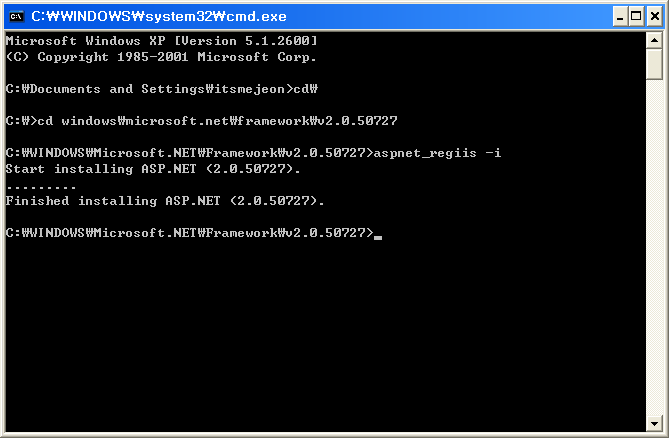 2) .NET Framework °¡ ¼³Ä¡µÈ µð·ºÅ丮·Î À̵¿ÇÑ´Ù. ( º¸ÅëÀÇ °æ¿ì : cd C:\WINDOWS\Microsoft.NET\Framework\v2.0.50727 )
