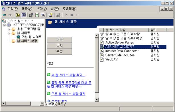Windows 2003 Server Á¦Ç°±ºÀÇ ÀÎÅÍ³Ý Á¤º¸ ¼ºñ½º ÇÁ·Î±×·¥ÀÇ °æ¿ì¿¡´Â <±×¸² 3>°ú °°ÀÌ À¥ ¼ºñ½º È®Àå ºÎºÐ¿¡¼ ASP.NET v2.0.50727(¶Ç´Â V3.5 µî)°¡ ±âº»ÀûÀ¸·Î ±ÝÁöµÊÀ¸·Î ¼³Á¤µÇ¾î ÀÖÀ¸¹Ç·Î À̸¦ Çã¿ëµÊÀ¸·Î º¯°æÇÏ¿©¾ß À¥Å¬¶óÀÌ¾ðÆ®°¡ ½ÇÇàµÇ¸ç À̸¦ º¯°æÇÏÁö ¾ÊÀ» °æ¿ì¿¡´Â ±âº» À¥ ÆäÀÌÁö(SampleStart.htm)´Â º¸À̳ª À¥ Ŭ¶óÀÌ¾ðÆ®¸¦ ½ÇÇàÇÒ ¶§ 404 ¿¡·¯ÆäÀÌÁö°¡ ¹ß»ýÇÑ´Ù.