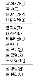 »ðÀÔµÈ Ç¥ ³»ÀÇ ¼¿À» ¼±ÅÃÇÑ ÈÄ ¸¶¿ì½º ¿À¸¥ÂÊ ¹öưÀ» ´©¸£¸é <±×¸² 1>°ú °°Àº ¼¿ ´ÜÃà¸Þ´º°¡ ³ªÅ¸³´Ù.