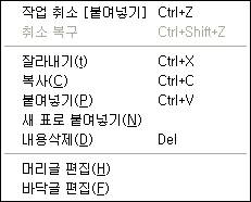 ÆíÁý ±ÛÀÚ¸Þ´º´Â ÀÛ¾÷ Ãë¼Ò, Ãë¼Ò º¹±¸, Àß¶ó³»±â, º¹»ç, ºÙ¿©³Ö±â, »õ Ç¥·Î ºÙ¿©³Ö±â, ³»¿ë»èÁ¦, ¸Ó¸®±Û ÆíÁý, ¹Ù´Ú±Û ÆíÁýÀÇ ¸Þ´º°¡ ÀÖ´Ù.