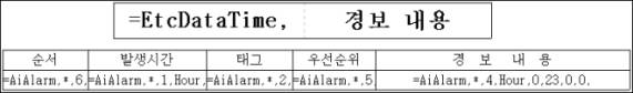 ¼¿ ¹®Àå ÆíÁý(°æº¸³»¿ë Çʵå) ¿¹1) =AiAlarm,*,4,Hour,0,23,0,0,