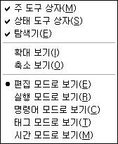 º¸±â ±ÛÀÚ¸Þ´º´Â ÁÖ µµ±¸ »óÀÚ, »óÅ µµ±¸ »óÀÚ, Ž»ö±â, È®´ë º¸±â, Ãà¼Ò º¸±â, ÆíÁý ¸ðµå·Î º¸±â, ½ÇÇà ¸ðµå·Î º¸±â, ¸í·É¾î ¸ðµå·Î º¸±â, ÅÂ±× ¸ðµå·Î º¸±â, ½Ã°£ ¸ðµå·Î º¸±âÀÇ ¸Þ´º°¡ ÀÖ´Ù.